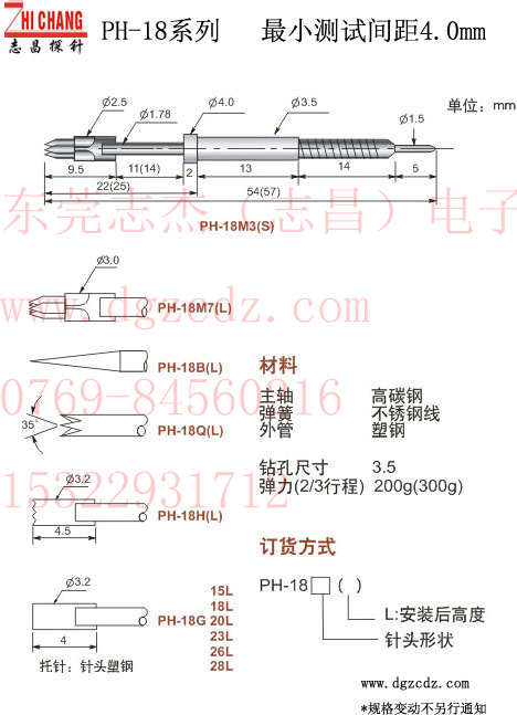 规  格: 探针系列 产品类别: PH-18系列测试针