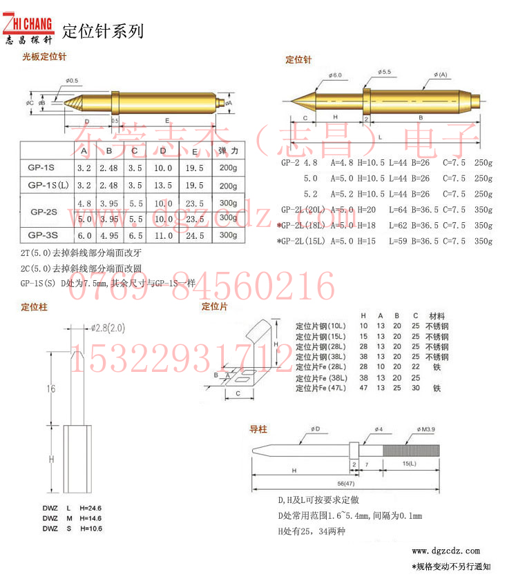 GP-1S(3.2),GP-1S(3.2)加长,GP-2(4.8),GP-2(5.0),GP-2(5.2),GP-2S(4.8),GP-2S(5.0),GP-3S(6.0),GP-2(5.0)加长,GP-2(5.0)圆,GP-2(5.0)M3,定位柱(2.0S,2.0M,2.8S,2.8M,2.8L等),导柱,定位片等