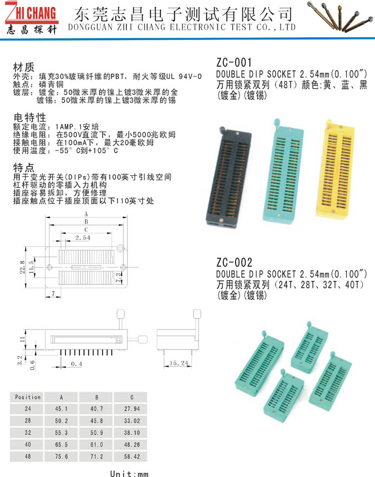 产品名称: IC测试座(万用型 产品备注: 48,40,32,28,24万用型测试座,2.54间距